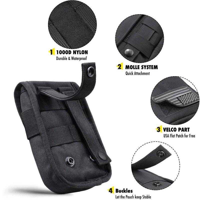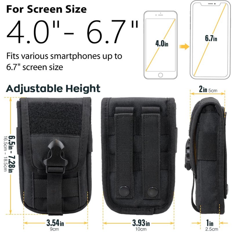 - CLASSIC MOLLE DESIGN WITH TWO STRAPS: Molle smartphone pouch design with Molle system. Two Molle buckle strap on the back could be attached to a tactical backpack, combat vest, tactical battle belt, or other MOLLE gears as an extra exterior pouch. Strong webbing belt loops on the rear, deadly hard-wearing, and heavy-duty.
