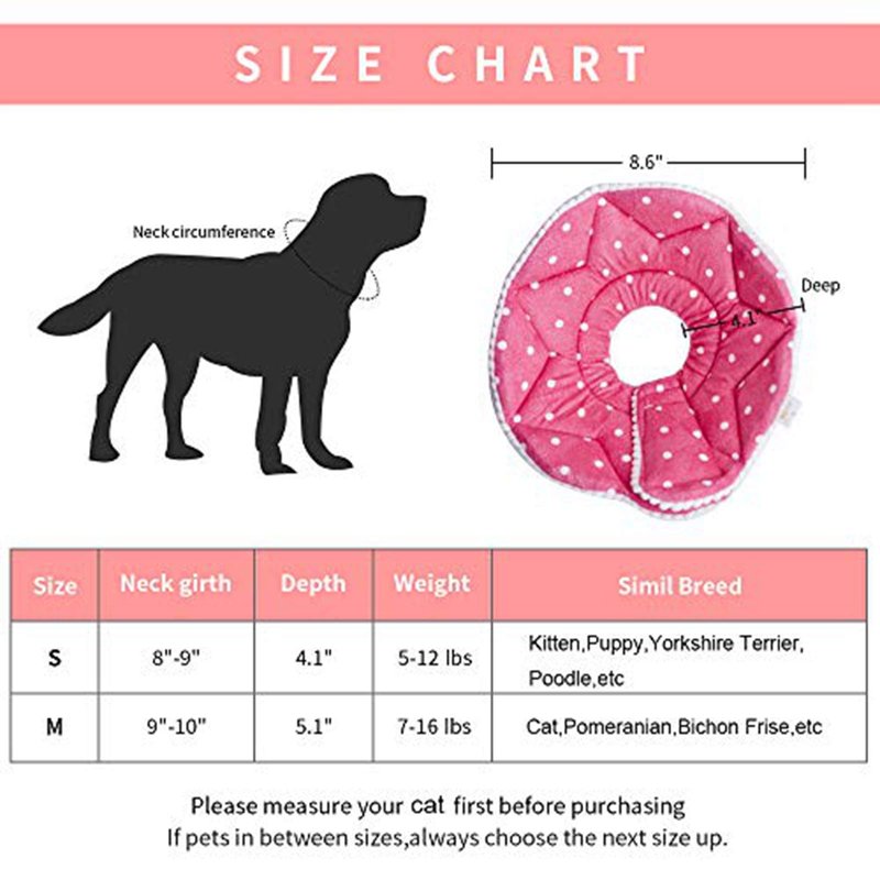WZPET,MORE COMFORTABLE FOR YOUR PET. This recovery cone is softer than the traditional plastic cone.Caring for pet is also anti-scratch and anti-bite,perfect for dogs and cats recovering from surgery. Pets may need a little time to get used to the recovery collar,but with a positive attitude and a little reward,like toys and snacks,your pet will gradually adapt and recovery better. NOTE: 1.Before purchase,measure the circumference of the dog's neck with a soft ruler,which can be relaxed by 1-2 cm. 2.It's very important to measure the length of your pet's neck to nose,the recovery cone extend beyond the cat nose to provide effectively protection Features: 1.The recovery collar is made of microfiber,softer,waterproof,lightweight and breathable. 2.The recovery collar is good protection post surgery. 3.Extraordinary adjustable loop type fasteners,it's very easy to remove and greater range of adjustment. 4.The cone is very flexible,pets can see his/her peripheral vision and eat or drink with the collar on. 5.It's especially useful when pets sleep,can be used as small pillow. CLEAN: Support hand or machine wash.If there is a small stain,wipe it clean. Package included:1 x Recovery collar. Welcome to share your experience with us after receiving the recovery cone. Please feel free to contact us if you have any questions.