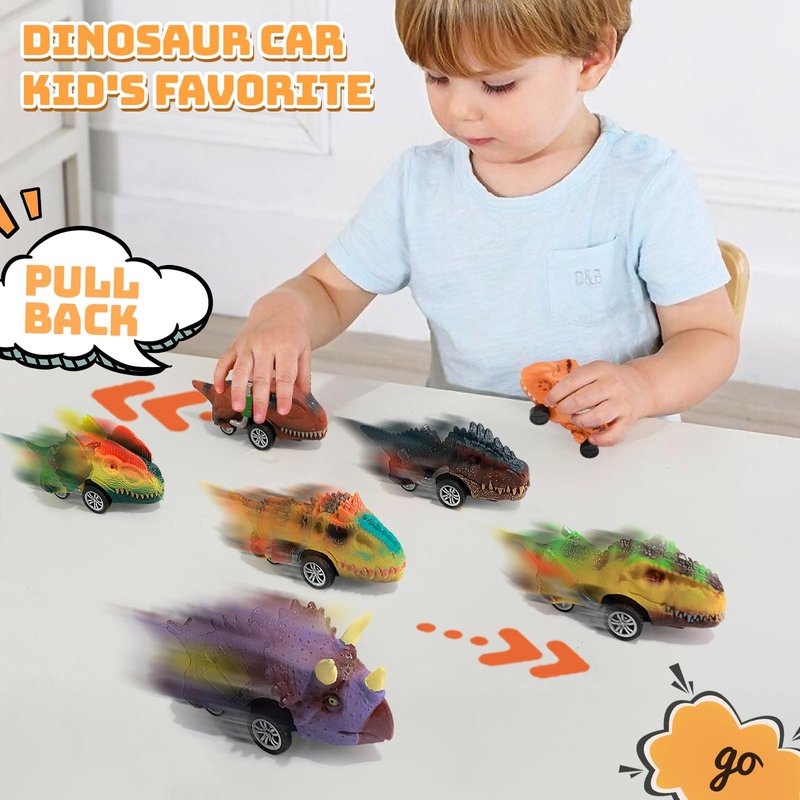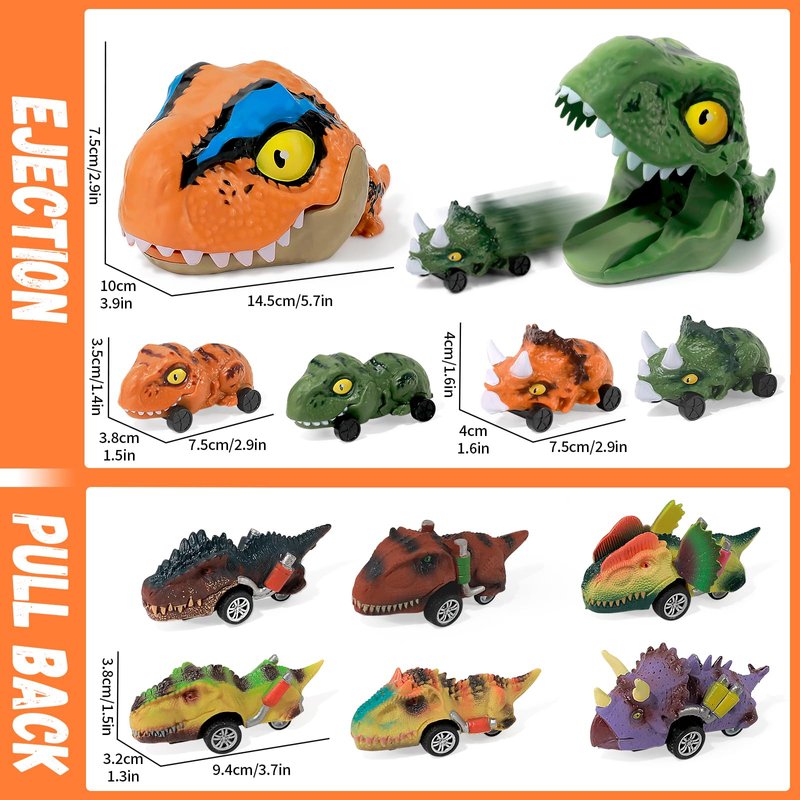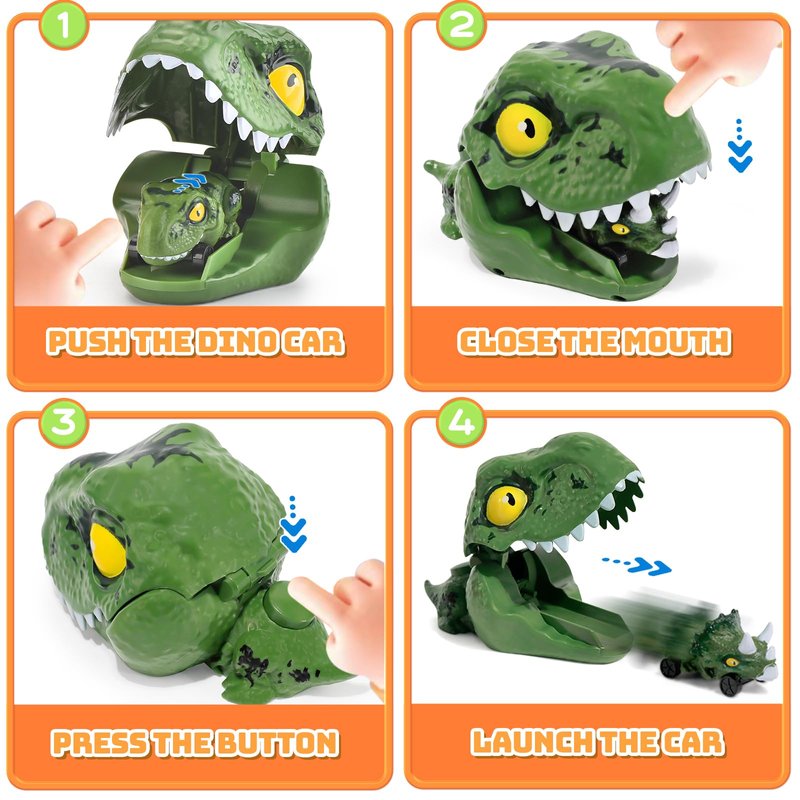 - 12 In 1 Dinosaur Toys: this kids dinosaur toys set includes 2 big Tyrannosaurus Rex launchers, 4 small dinosaur ejection cars and 6 pull back cars(don't fit in the laucncher). Just press the button, push the small dinosaurs along the track into the big dino mouth, and press the button and launch.
