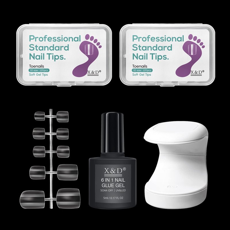 X&D Fake Toe Nail Kit 240pcs Clear Soft Gel Full Cover Toenail Tips 10 Sizes with Nail Glue Gel for Foot Nail Art DIY Manicure