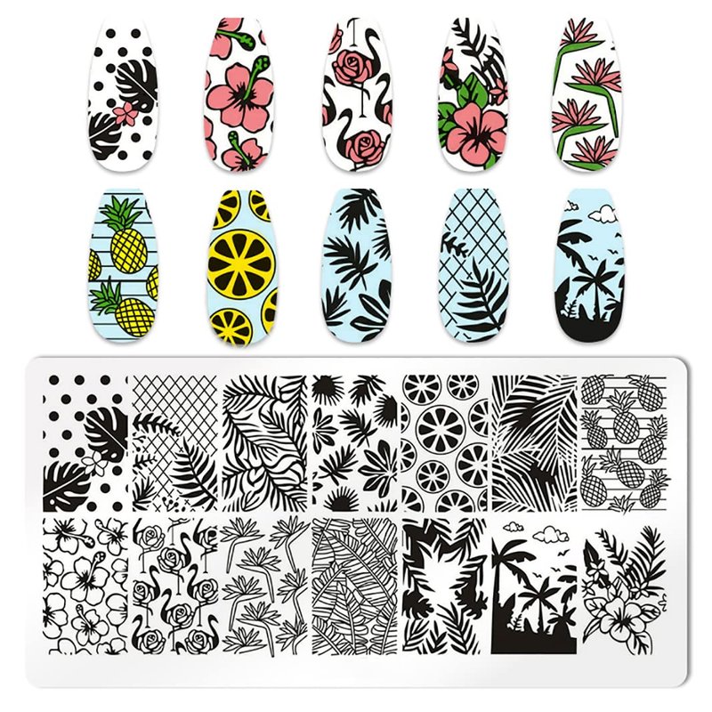 - 🌴【Easy To Use】:Easy to stamp and transfer, each plate has blue protective film which can protect them from scratching, you can use the nail polish and other relative tools (please refer to the picture for specific steps) to stamp and get the cute patterns.(Warm tips:THE SCRAPER AND STAMPER ARE NOT INCLUDED.)