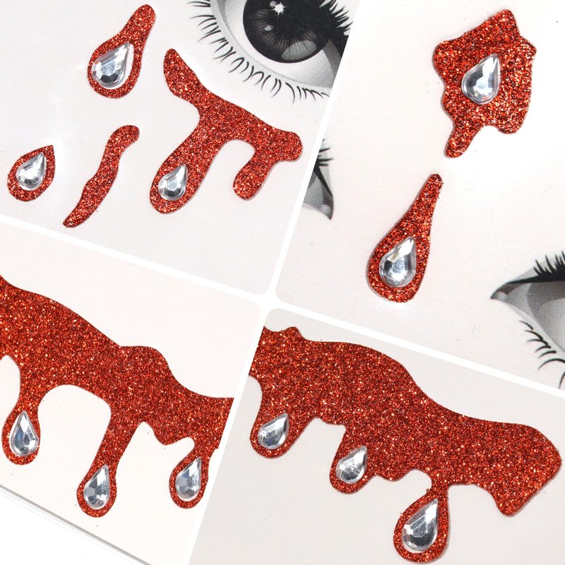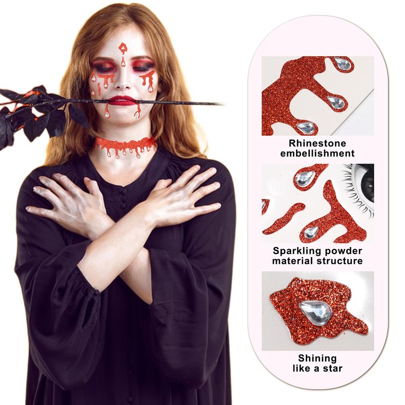 Xepeelo 3D Halloween Face Sticker Red Glitter Face Temporary Sticker Sliver Diamond Face Art Stickers Red Glitter Art Sticker Design Halloween Party Face/Body/Eye Accessories for Children Adult