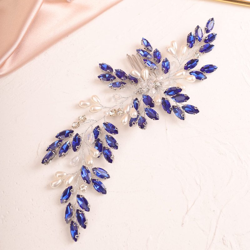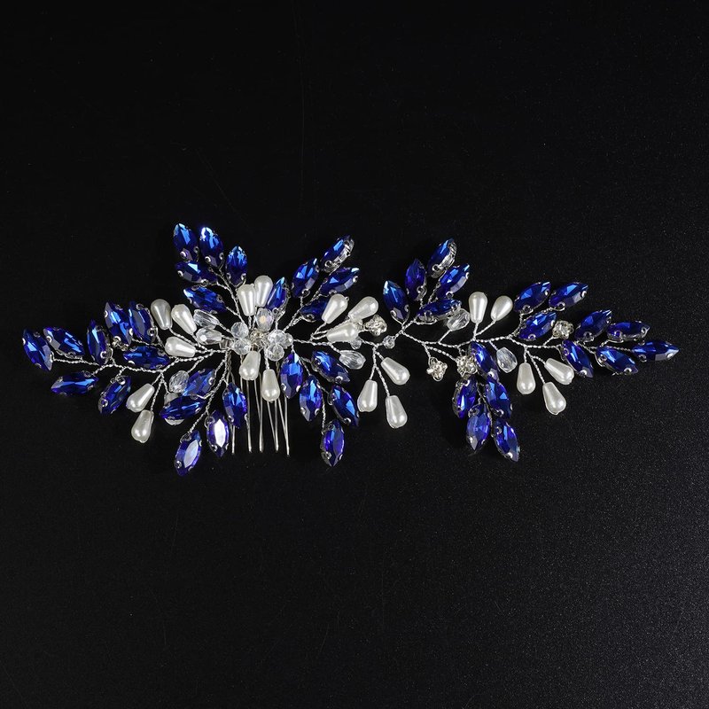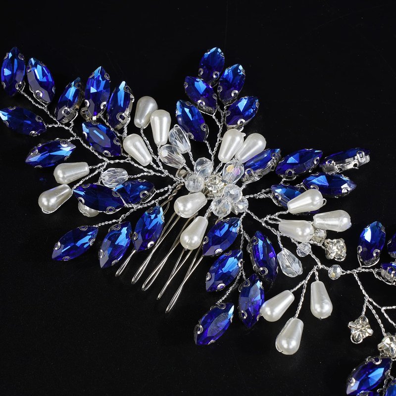Xerling Vintage Hair Comb Brides Wedding Blue Crystal Hair Accessory Bridal Headpiece Pearl Hair Piece Jewelry (Blue)