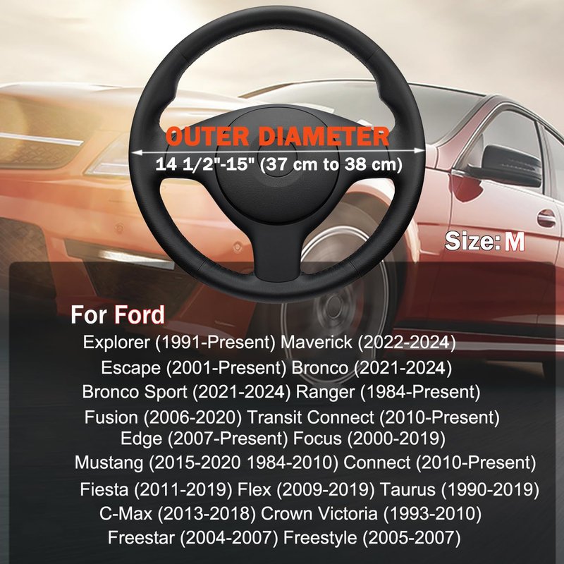 - 【CUSTOM FIT】This steering wheel cover fits for Ford all 14.5-15 inch (37 cm to 38 cm) standard steering wheels, Fits for Ford Explorer (1991-2024) Maverick (2022 2023 2024) Escape (2001-2024) Bronco (2021-2024) Bronco Sport (2021-2024) Ranger (1984-2024) Fusion (2006-2020) Transit Connect (2010-2024) Edge (2007-2024) Focus (2000-2019) Mustang (2015-2020 1984-2010) Ecosport (2018-2024) Fiesta (2011-2019) Flex (2009-2019) Taurus (1990-2019) C-Max (2013-2018) Crown Victoria (1993-2010) Freestar (2004-2007) Freestyle (2005-2007).