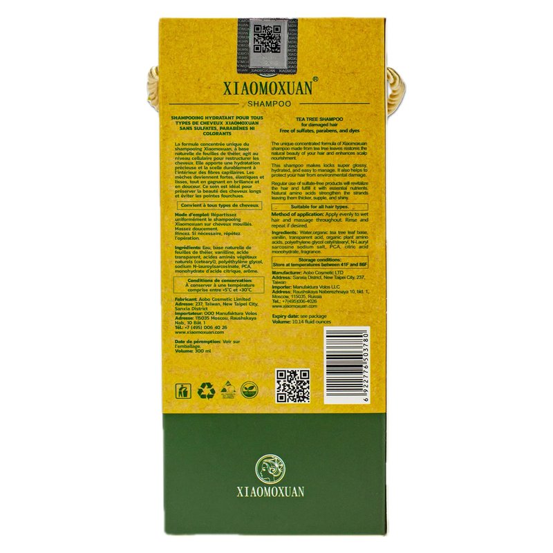 Xiaomoxuan tea tree shampoo for dry damaged hair, no sulfates, parabens, chemicals, dyes. The unique concentrated formula of Xiaomoxuan shampoo made from tea tree leaves restores the natural beauty of your hair and enhances scalp nourishment. This shampoo makes locks super glossy, hydrated, and easy to manage. It also helps to protect your hair from heat damage by using hot tools. Regular use of chemical-free, sulfate-free hair care products will revitalize the hair and fulfill it with essential nutrients. Natural amino acids strengthen the strands leaving them thicker, supple, and shiny. Suitable for all hair types.Method of application: Apply evenly to wet hair and massage throughout. Rinse and repeat if desired.Ingredients: Aqua/Water, Organic Tea Tree Leaf Base, Vanillin, Transparent Acid, Organic Plant Amino Acids, Polyethylene Glycol Cetyl/Stearyl, N-Lauryl Sarcosine Sodium Salt, PCA, Citric Acid Monohydrate, Fragrance/Parfum.Storage conditions: Store at temperatures between 41F and 86F, 5C and 30CVolume: 300-ml (milliliters), 10.14-fl oz (fluid ounces)Expiry date: See package
