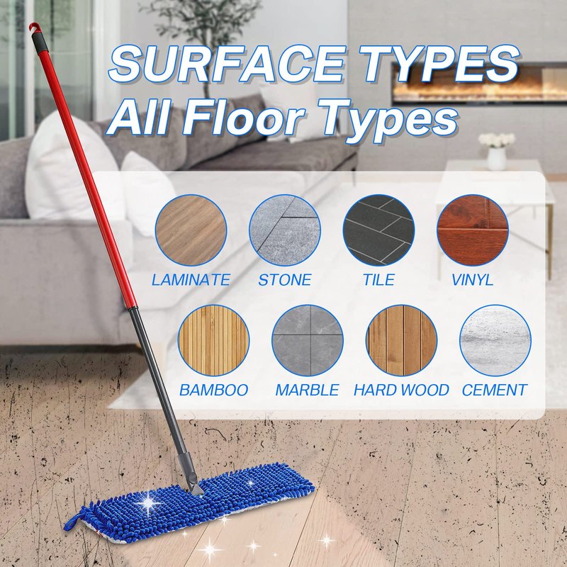 - Muti-purpose: Two-in-one mopping system. The cleaning qualities of microfiber eliminate the need for chemical cleaner. Great to use wet or dry on all floor types. It is suitable for use on all types of hard floor surfaces in homes, work, schools, restaurants, and much more. Mop Head rotates 360 degrees for easy cleaning.