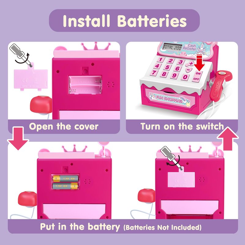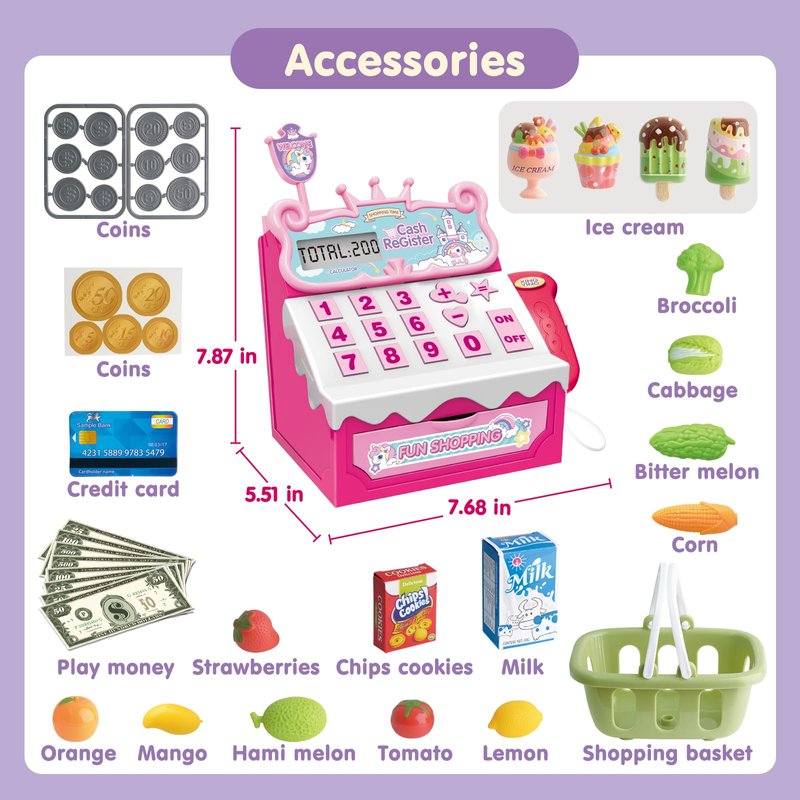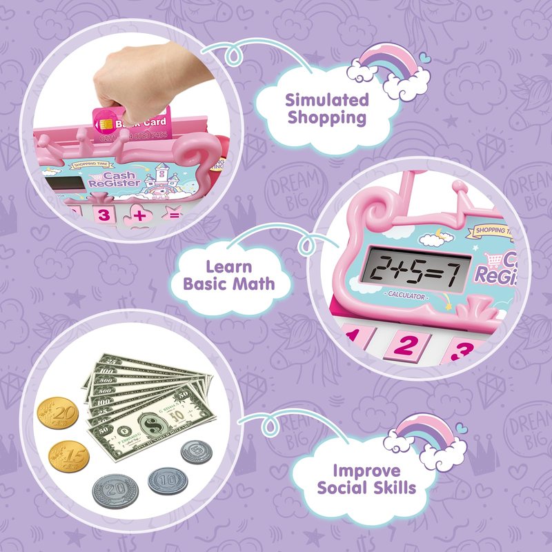 - Pretend Play Toy Cash Register: Built in a real calculator, kids can learn basic money & math skills more easily with this real-working play cash register during fun playtime. Children can experience the fun of shopping from an early age, recognize the shape of many kinds of food, fruits and vegetables, and develop their communication skills while playing the role of cashier or customer