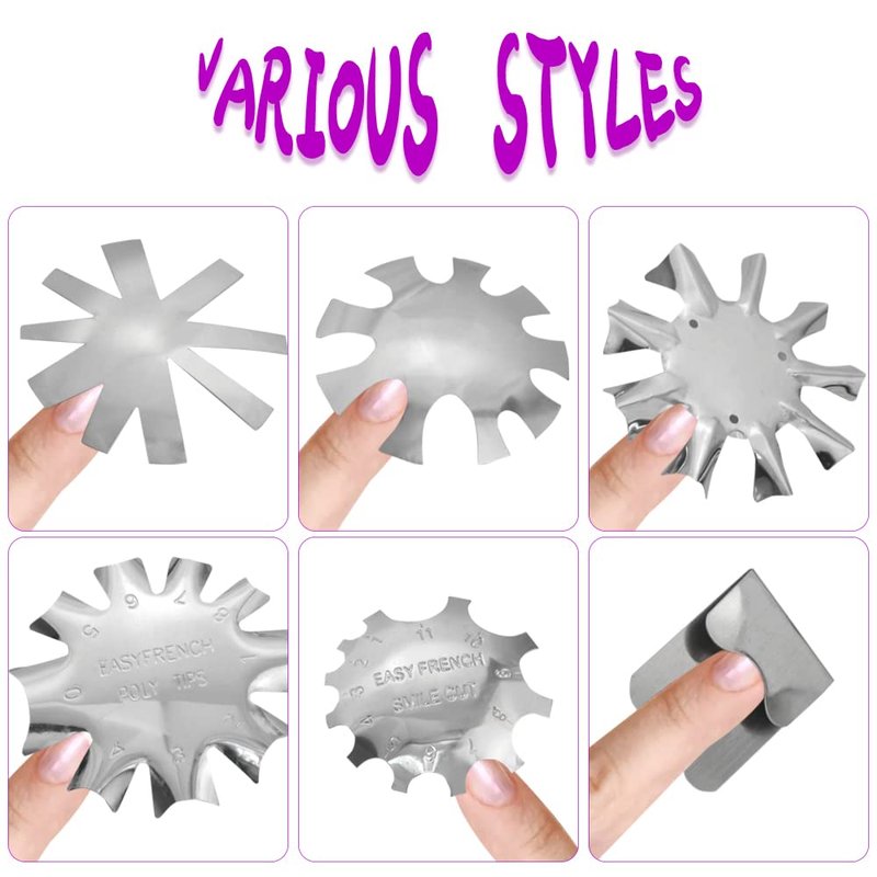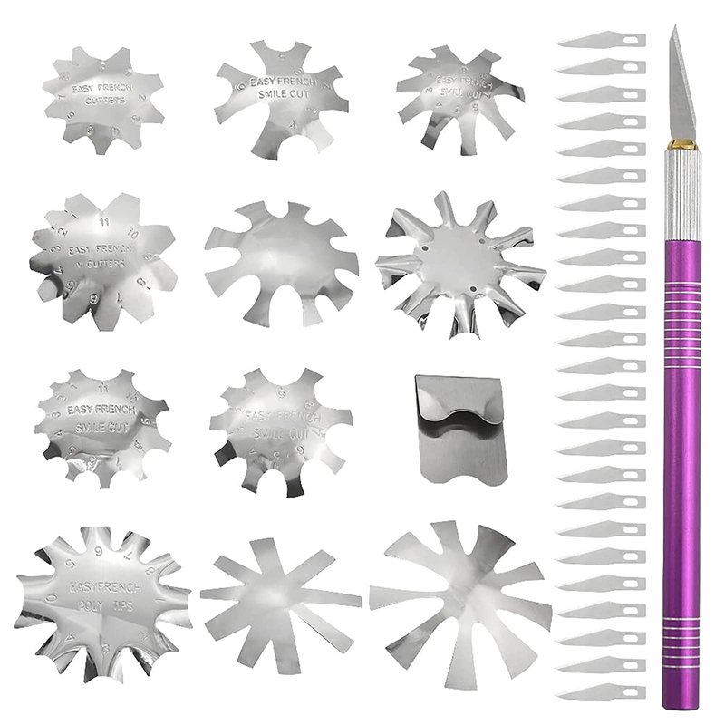 - √ [Package includes] →The french nail cutter kit includes 12 different styles of French nail knives, 1 handle cutting knife and 25 spare cutting knifes. There are many styles and quantities to meet your DIY acrylic nail needs.