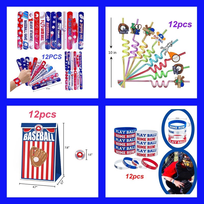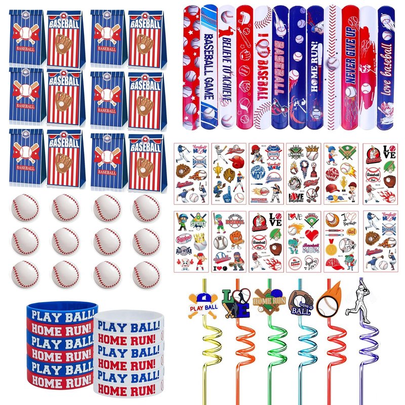 - PACKAGE - Baseball party favors Include 12 baseball present bags, 12 baseball slap bracelets, 12 baseball silicone bracelets, 12 baseball straws, 12 tattoo stickers, 12 mini baseballs, total 72 pieces baseball party favors, will be great for kids party favors.