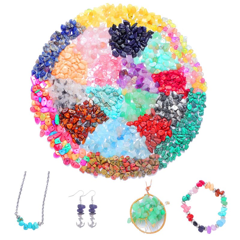 - [All-in-one Jewelry Making Kit] The jewelry making kit includes about 1200 PCS chips gemstone beads of 20 assorted colors, 170 PCS silver cute pendants (7 Kind of Shape) , 50 x Earring Hooks, 50 x T-Head Pins, 50 x 9-Head Pins, 10 x Lobster Clasps, 50 x Silver Jump Rings, 3 x Jewelry Wire(Clear/Silver/Gold) and 1 x Tweezers, 1 x Jump Ring Opener Tool, 1 x Flat Nose Pliers, packed in a 24 grids box, it's a perfect bracelet making kit for adults, girls
