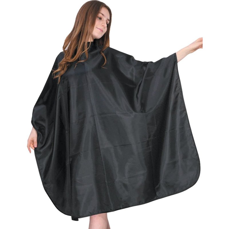 This economical cape is affordable. It is made of sleek and thin polyester material. It easily covers any client with its extra large size. It includes a sewn-in loop to hang the cape when not in use, as well as an adjustable snap closure that fits different necks. The cape is perfect for hair cutting, perming. It washes well and is a welcome addition for giving haircuts. Just shake the hair off after used. The quality is far superior to what you expected.