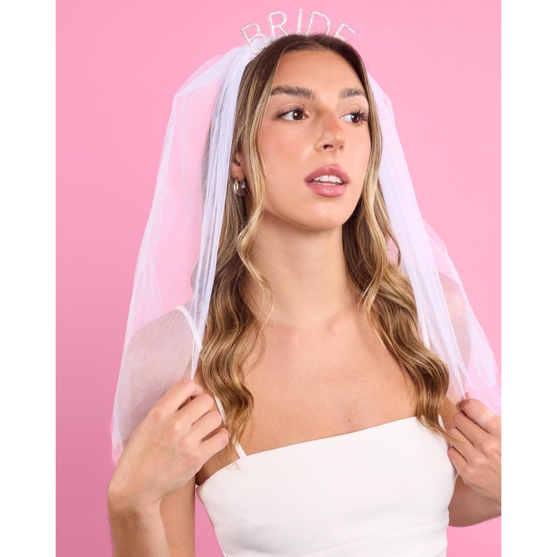 - Bride to Be: our metal headband with rhinestone "Bride" logo + white detachable veil is the cutest and easiest to use bach party favor that your Bride will love and use again!