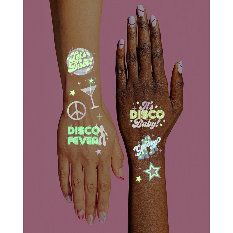 - Let's Party: two sheets with a total of 82 glow in the dark tattoos featuring iridescent foil hand drawn designs of disco balls, peace signs, groovy texts + more that guests will absolutely love!