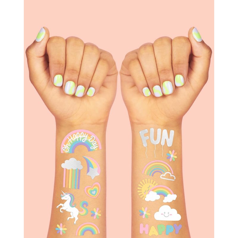 - Tats for Every Unicorn: two sheets with a total of 46 colored + metallic tattoos featuring handdrawn designs of vividly colored rainbows, unicorns, suns, shooting stars, peace signs + more that kids will absolutely love!