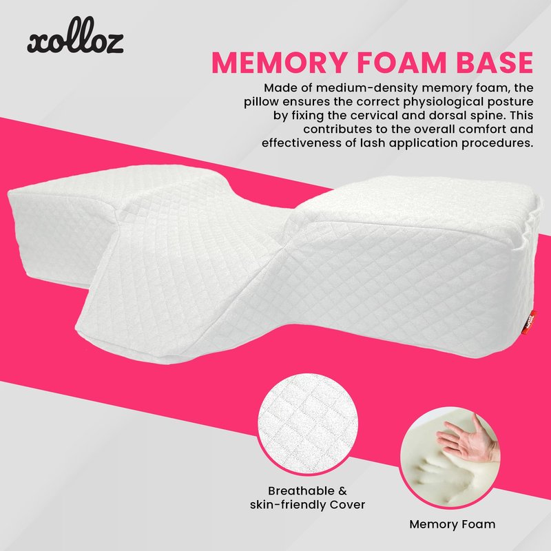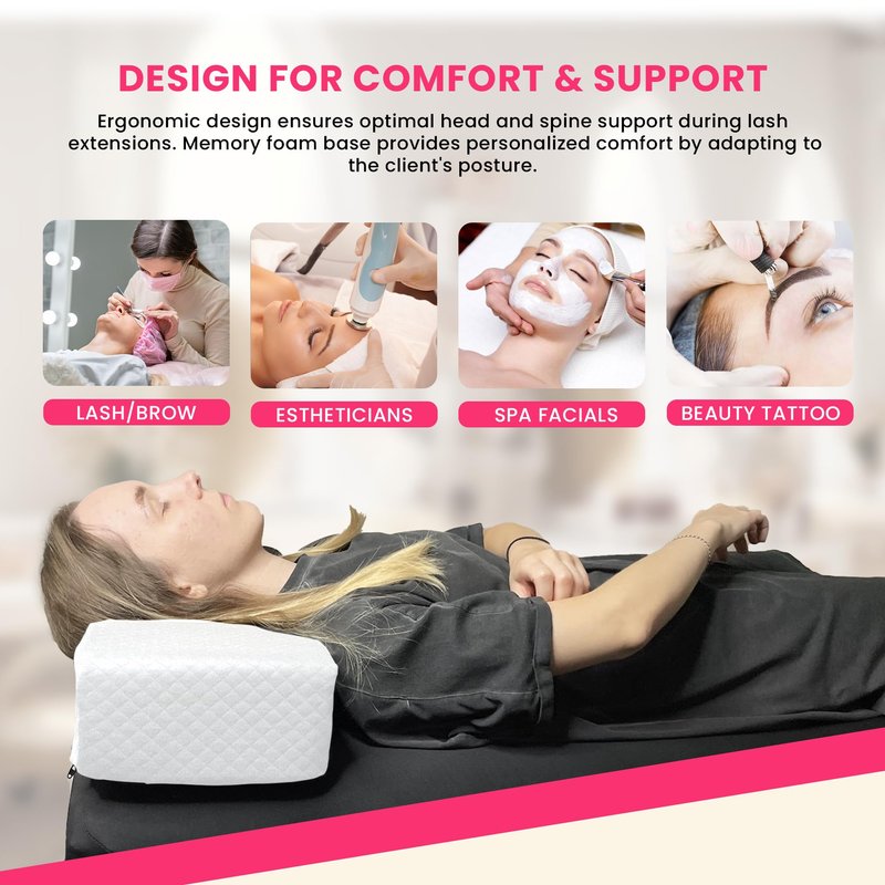- [ORTHOPEDIC DESIGN] - The eyelash pillow has an ergonomic curved shape design to support the head of the customer in the right position during the lengthy process of lash extension. The extension wedge of the lash extensions pillow supports the customer’s upper back and dorsal spine for maximum comfort.