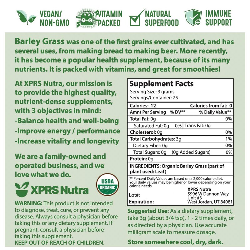 - Love Your Supplements: You'll love the superior quality and convenience of our barley powder. Here at XPRS Nutra, our priority is ensuring that we are providing our valued customers with premium supplements in an ethical manner. We are committed to provide the supplements you want & need at an affordable rat. Don't like the taste of barley grass juice powder organic? Try filling it in our empty capsules.