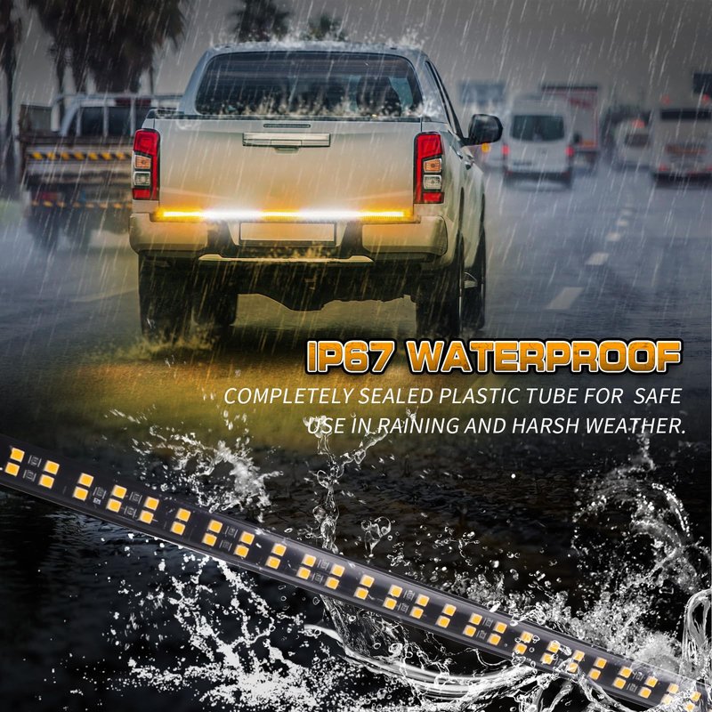 - 【HIGH-QUALITY】This tail light strip is well-made and lightweight, low consumption and IP67 waterproof. The clear PVC tube is completely sealed for safe use in harsh weather. Even driving through lots of rain, highway speeds, potholes, the safety light can still stay on and work great.