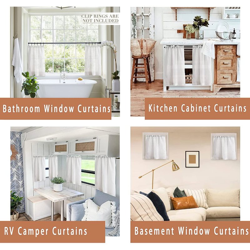 - WHERE TO USE:These linen Short curtains are not only suit for the kitchen window, but are also the perfect addition to your small bedroom windows, bathroom or bay windows, laundry room, loft, basement, cabinet , RV or camper. These small kitchen curtains can be paired with farmhouse, coastal,rustic, modern or vintage style home decor as you like.