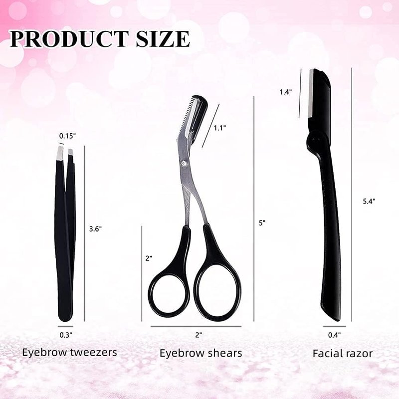 Color; BlackProfessional eyebrow trimming basic set, make you more beautiful.This eyebrow trimming tool will help you trim your perfect eyebrows step by step. Provide you with an excellent eyebrow trimming experience High-quality, skin-free eyebrow trimming tools are suitable for all eyebrows and skin types. Perfect and beautiful eyebrows can bring you good luck. Materials; These eyebrow trimming tools are made of stainless steel and qualified plasticDo not contain any harmful ingredientsPackaging;1x eyebrow trimming scissors with comb1x replacement comb 1x eyebrow trimmer 1 x eyebrow trimming tweezer。