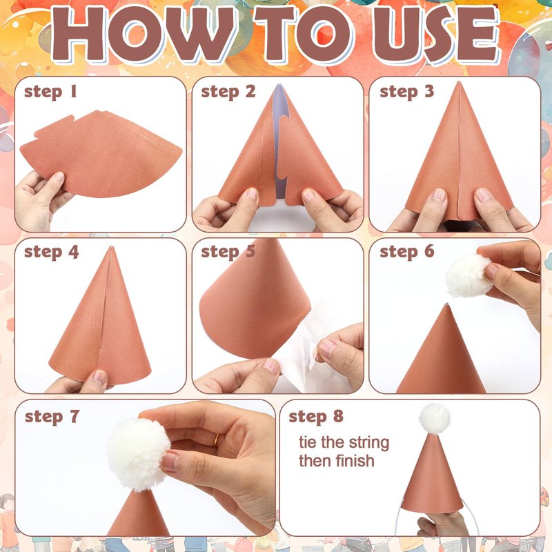 - Easy and Fun to Assemble: the neutral birthday hat with white pom pom is shipped disassembled to prevent it from being crushed or deformed during transportation; Assembly is very simple, just fold the hat into a fan shape, pass the rope through the hole, and use the provided glue to stick on the fluffy 1.57 inch/ 4 cm pom pom