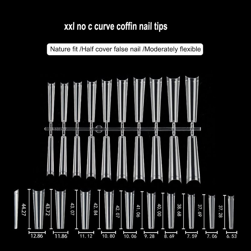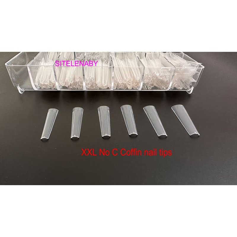 SITELENABY XXL NO C curve coffin nail tips 500pcs per box we also have xxl no c curve square 3xl no c curve coffin 3xl no c curve square the series of no c curve shape tips very easy to shape ,