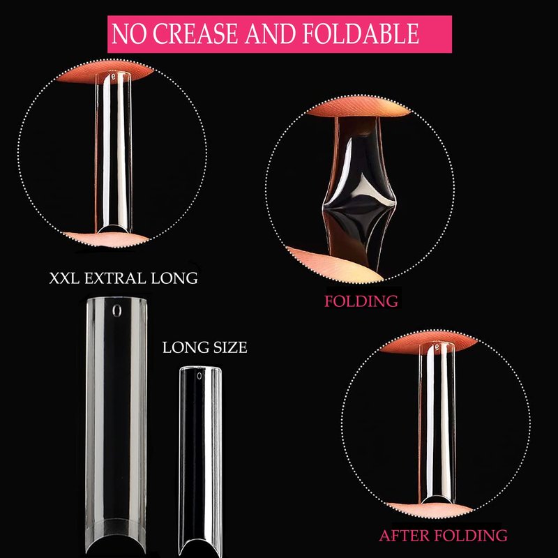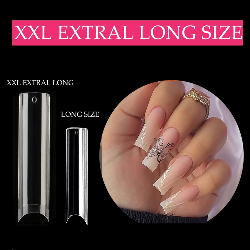 - 【Flattened No C Curve Square】 No c curve xxl long clear nail tips have been fully upgraded, its curvature is not so deep, the lines are flatter, it is better to fit your nail bed, won't pop up, this allows you to wear it for a longer period of time, up to 3-4 weeks.