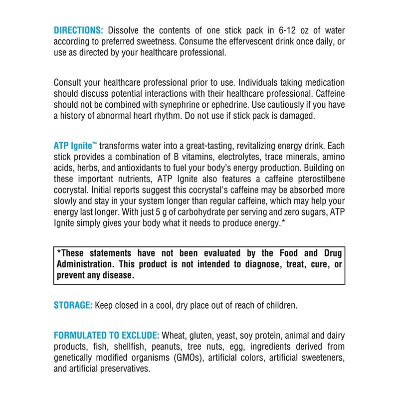 - With just 5 g of carbohydrate per serving and zero sugars, ATP Ignite simply gives your body what it needs to produce energy.*