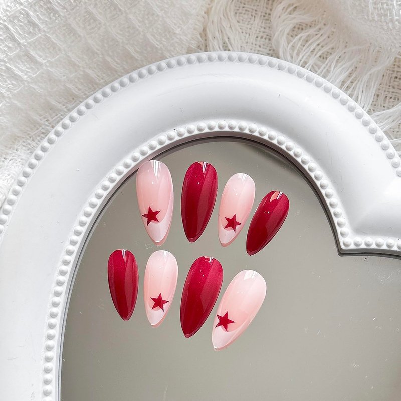 Y2K Press on Nails Medium Almond MABKJLF French Tip Fake Nails Wine Red Full Cover Red Star False Nails with Designs Glossy Glue on Nails Acrylic Nails Manicure Artificial Nails for Women Girls 24Pcs