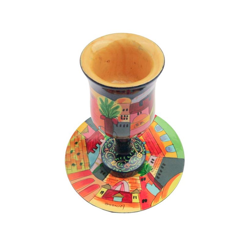 - This beautiful and colorful Kiddush cup will be an excellent item for your Shabbat and festive day table. The set features the gorgeous vistas of the holy city of Jerusalem.