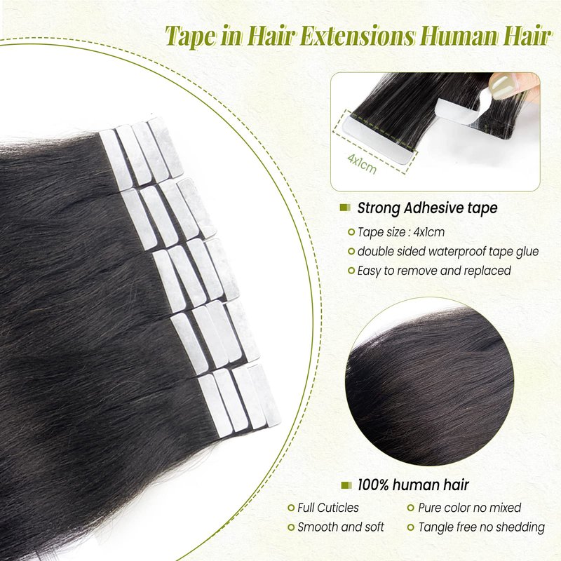 - 【Yaki Straight Tape in Hair Extensions Human Hair 】---Yaki straight tape in extensions, made of 100% 9A Premium same direction cuticle aligned virgin hair. Natural black hair extensions Light Yaki tape ins is more healthy soft, no dry and no split hair ends. Yaki straight hair extensions real human hair tape in extensions for black women, can be washed, straightened, conditioned and restyled as your own hair .