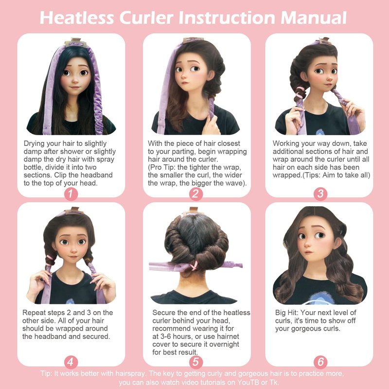 - Easy To Use:1-Drying your hair to slightly damp after shower. Slightly damp the dry hair with spray bottle or wet brush. 2-Use clip to fix the middle of the curling rod on the top of the head. 3-With the piece of hair closest to your parting, wrapping hair around the heatless curler and secured, repeat on other side, and tie them into a knot. 4-recommend wearing it for at 3-6 hours, or use hairnet cover to secure it overnight.