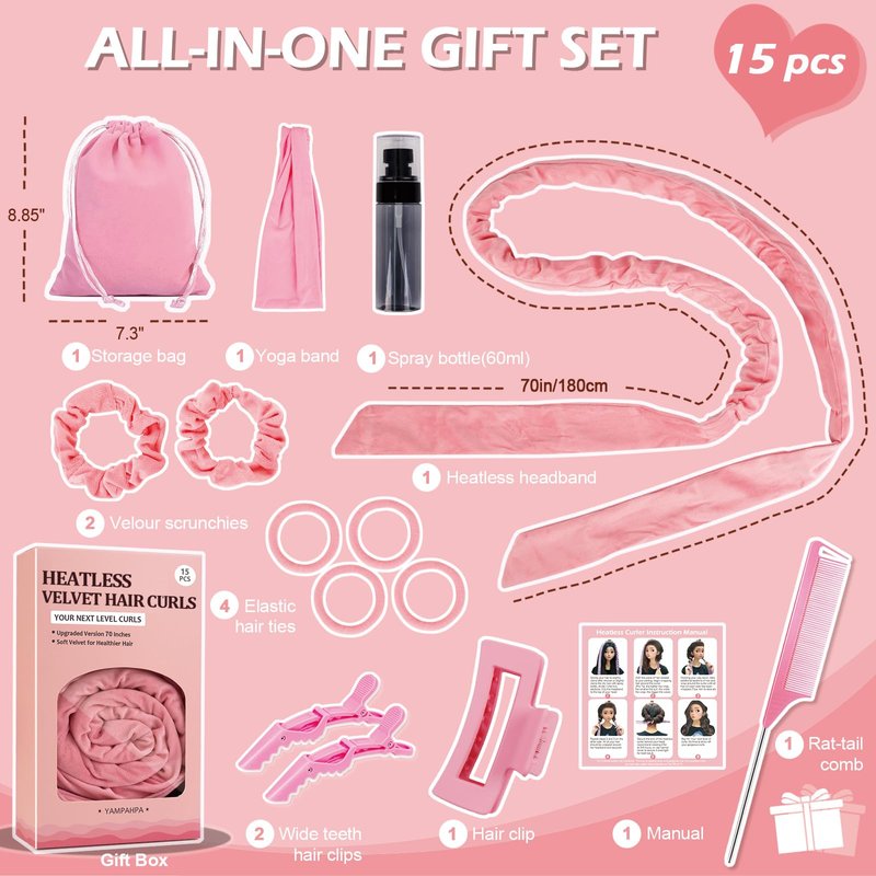 - 15 Pcs Hair Curlers Set:All-in-One travel hair curlers kit includes 1 x 70-inch long curling headband, 2 x velour hair ties, 4 x elastic hair ties, 1 x hair clips, 1 x rat tail comb, 1 x spray bottle, 1x yoga band, 1 x storage bag and instruction, and it's well-packed with an exquisite gift box. This heatless curls headband allows you to get a beautiful wave hair any time!