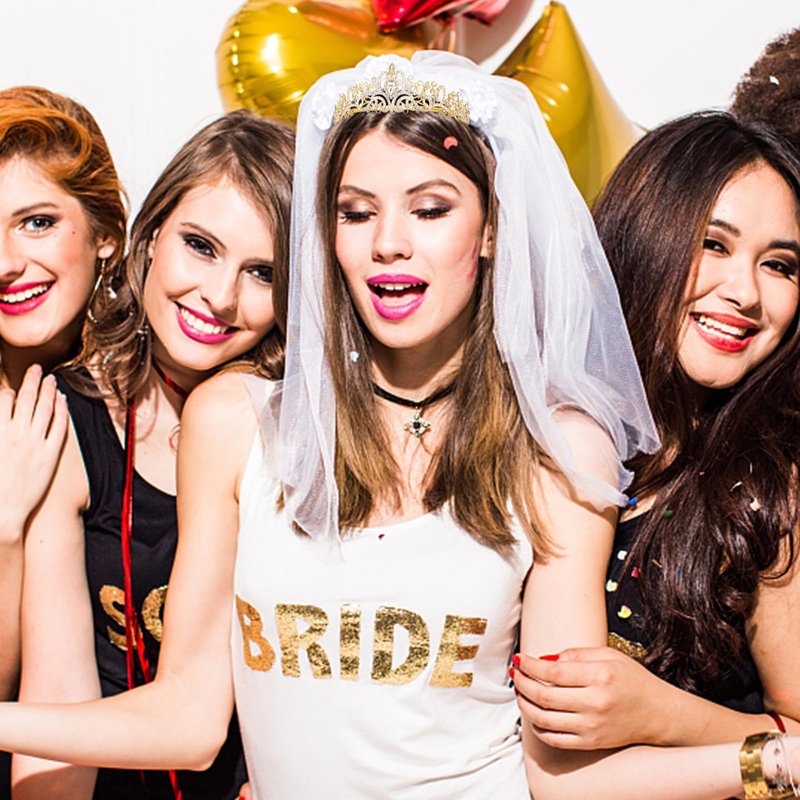 - Bachelorette Party Supplies: Package includes 1 bridal crown, 1 veil, a must have set for bachelorette party! Veil can be folded and stored when not in use, easy to clean and reusable. Plastic comb sewn on the veil, will not pull your hair, easy to wear for a long time.