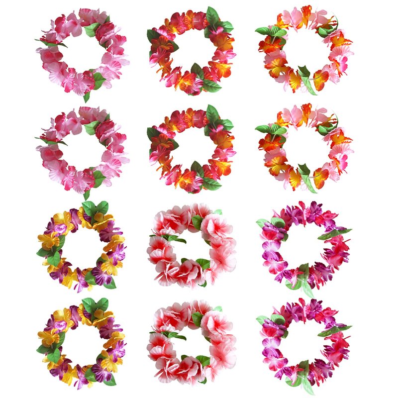 - HIGH QUALITY: This hawaiian headband set are made of high quality smooth shiny soft plastic, will not hurt your body. Color: as shown in the pics, package: 12 pcs hawaiian headband, approximate circumference: 21.7"