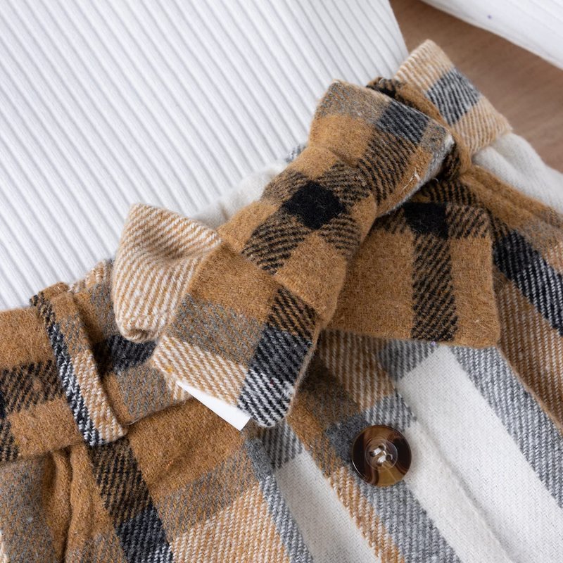 - Design-- 2 Pieces cute baby girls' skirt outfits, solid color, ribbed, round neck, ruffles, long sleeve tops, matches button-down plaid mini skirt with bowknot belt and pockets, chic and stylish.