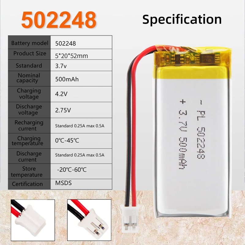 AKZYTUE 3.7V Rechargeable Lipo Battery 500mAh 502248 Lithium Polymer ion Battery Pack with JST PH2.0mm Connector