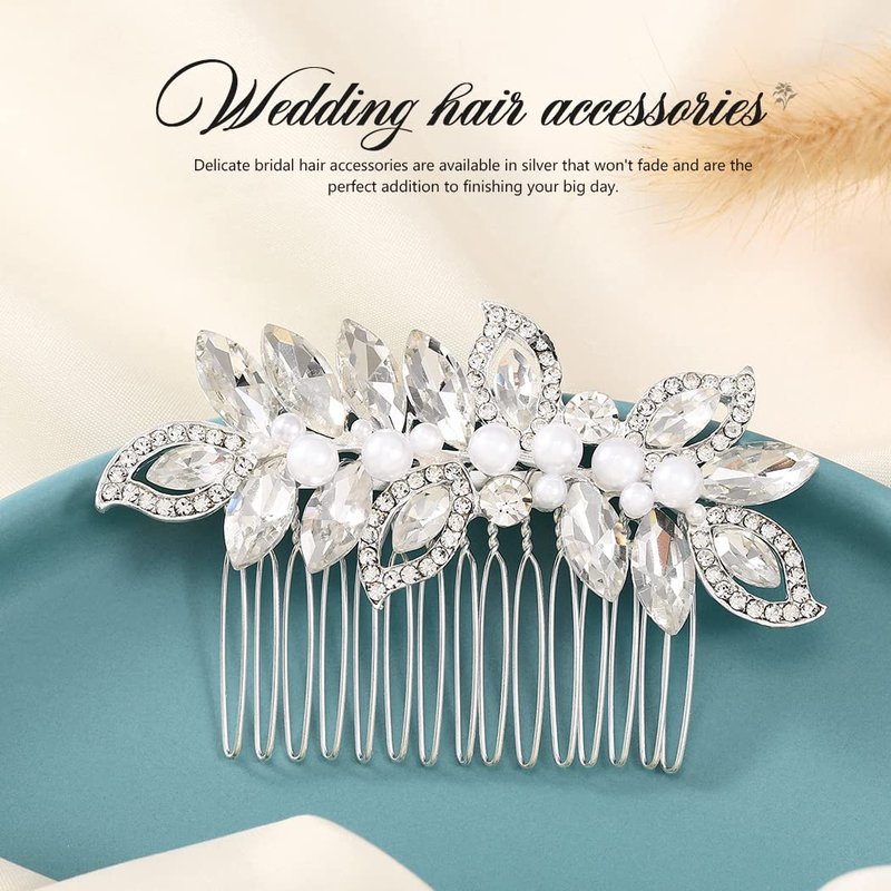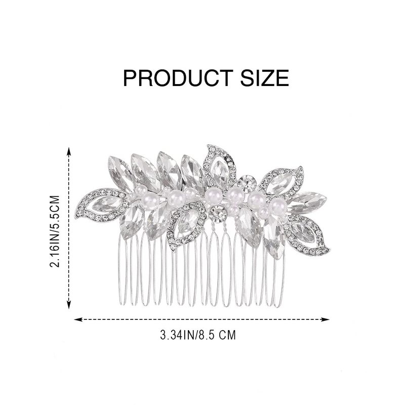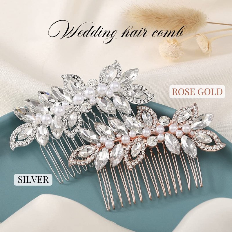 Yean Crystal Bridal Hair Comb Rose Gold Pearl Hair Piece Rhinestone Leaf Wedding Hair Accessories for Bride and Women (Silver)