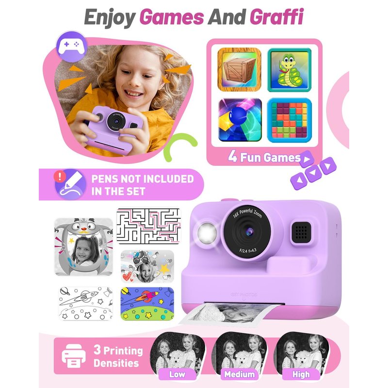 Yehtta kids instant camera is equipped with a 2.4-inch IPS screen, clear 1080P high resolution video, 16x digital zoom, black and white instant prints, color photo shooting, continuous shooting, time-lapse, and filters, flashlight,as well as a built-in MP3 player and 4 fun kids' puzzles