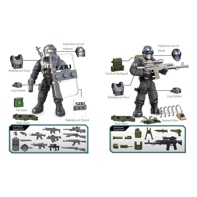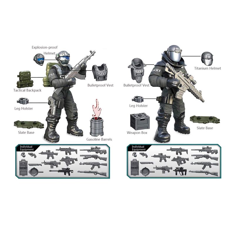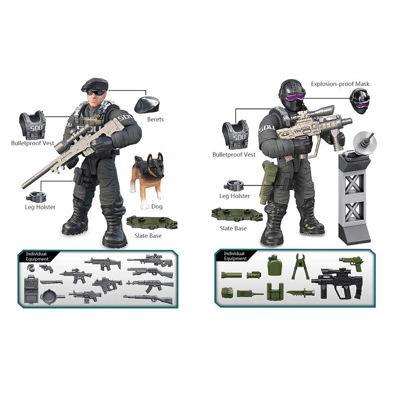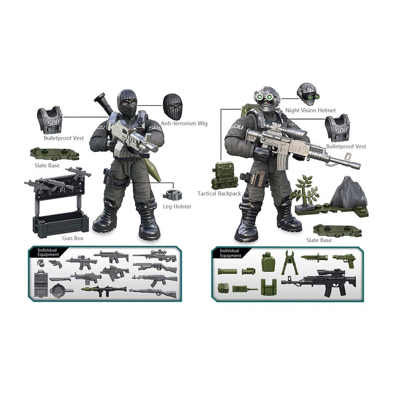 Product Description: This is a great 2-in-1 Military Action Figure playset! Firstly, you need to assemble them by yourselves from the pieces arrived. Then you can release instructions and command your army man to fight! The detailed plastic figures are movable with arms and legs. So you can make a variety of poses to meet the need of the battlefield. WARNING: CHOKING HAZARD-- Small parts. Not for children under 3 years. Note:- Please refer to the measurement. Tiny measuring error is allowable in normal range. - There might be a little color difference due to the monitor, camera or other factors, please refer to the physical item.
