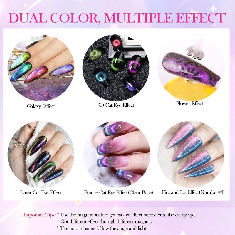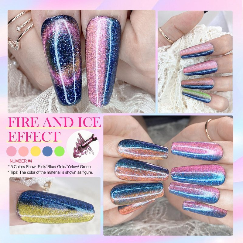 - ❄️Ice And Fire Effect: #4 is ice and fire 9D cat eye gel, it can shows 5 colors- pink/blue/yellow/gold/green colors in this upgrade formula. Different colors depending on the light and angle!