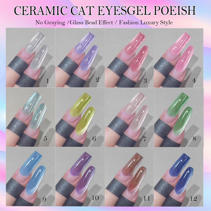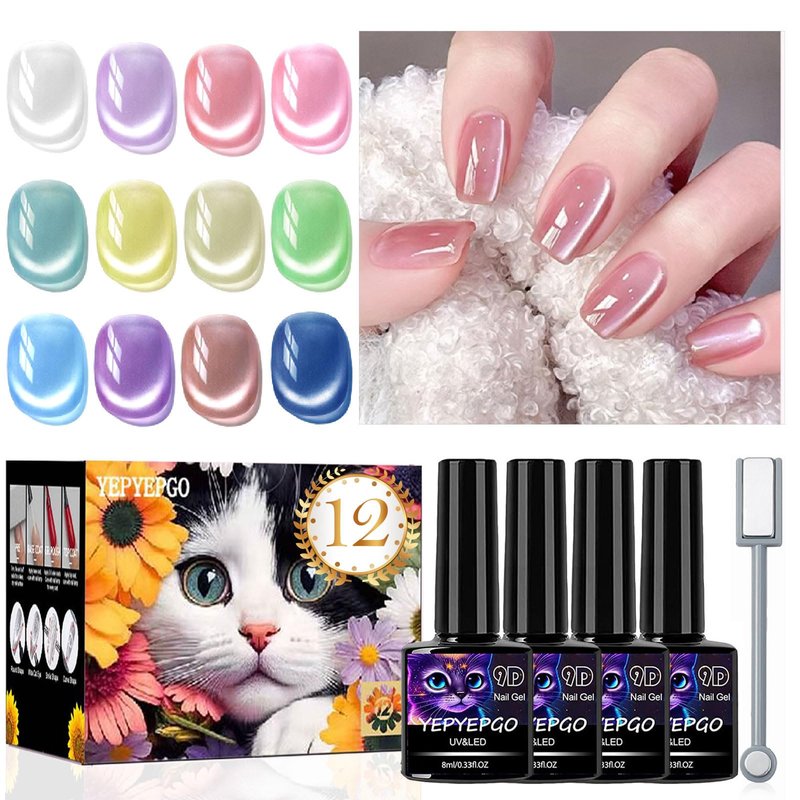 - Moonlight Cat Eye Gel Nail Polish Set: YEPYEPGO cat eyes gel kit includes 12colors 8ml / 0.33 fl.oz gel polish. This cats eye gel polish includes silver nude pink yellow green blue purple series. Each kit comes with dual-head magnetic stick which can create different cat eye style for your nails art.