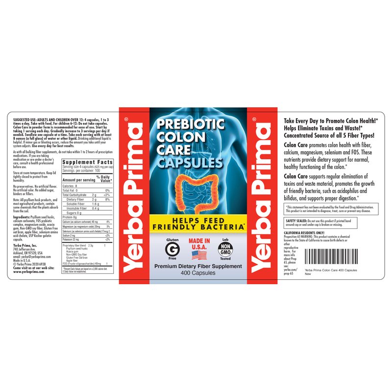 - TWO BOTTLES: YerbaPrima Prebiotic Colon Care Formula - 400 Capsules. Formerly known as just 'Colon Care'. Same ingredients as before.