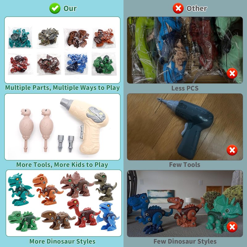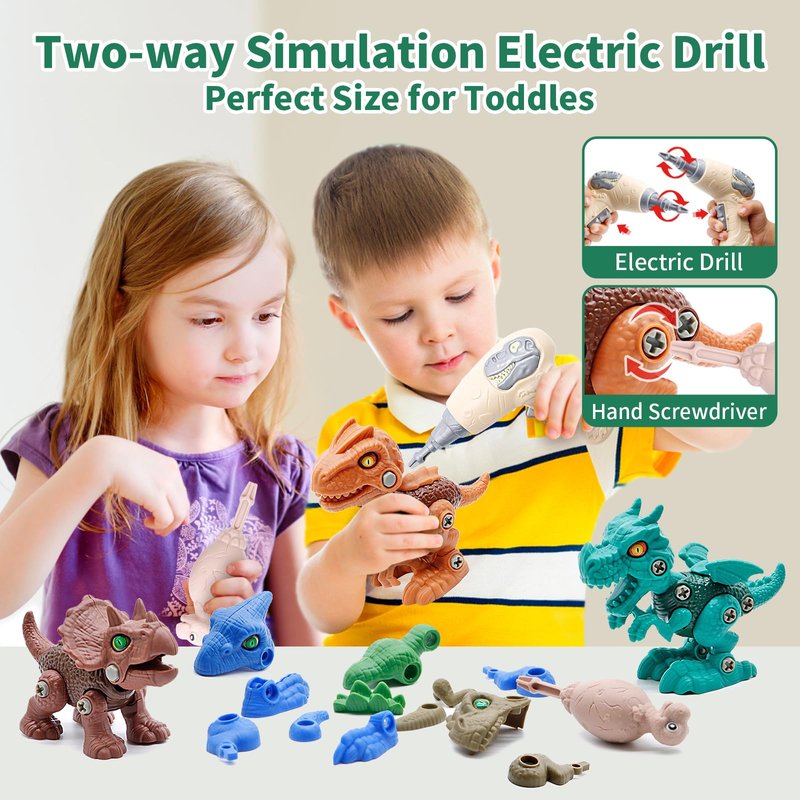 - Easy to Assemble Dinosaur Kids Toys: Our take apart toys set contains 1 electric drill with 2 different drill bits, 2 manual dinosaur screwdrivers and assemble instructions. Multiple tools support multiple children playing together. The electric drill with a slow motor, which can be rotated to tighten & loosen screws and encounter obstacles will automatically stop, you don’t worry about your child being injured while playing. Children 3-7 years old can use the electric mode or manual mode to assemble different dinosaurs. Two different ways can let the children have more fun.