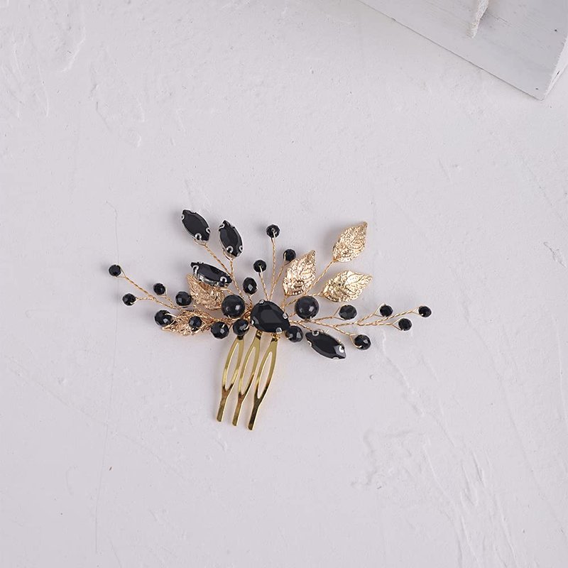 YERTTER Wedding Black Crystal Leaf Bridal Hair Comb Clip Leaves Wedding Hair Accessories for Bride Bridesmaid Flower Girls (Black and Gold)