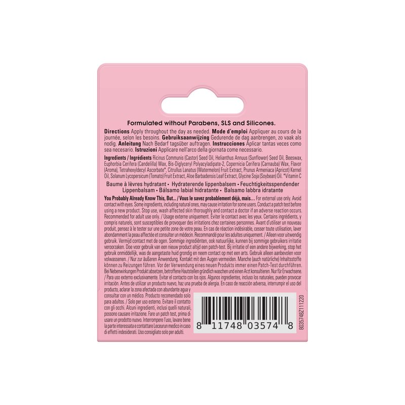 - FORMULATED WITH WATERMELON EXTRACT & APRICOTT KERNEL OIL: Watermelon Extract: Refreshing ingredient, packed with water and antioxidants, leaving lips lightly hydrated, refreshed and smoother looking. Apricot Kernel Oil: Emollient oil that easily sinks into the skin to help soften dry, cracked lips.