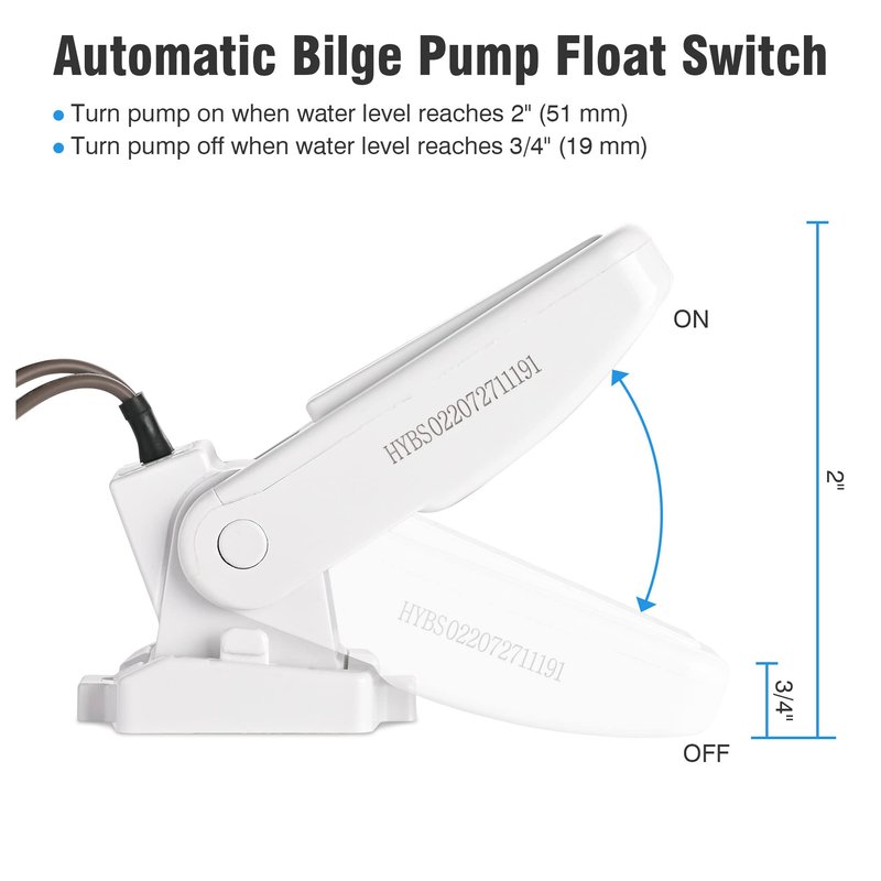 - Easy to Use - Comes with an automatic float switch which will turn the bilge pump on when water level reaches 2” and turn it off when water level reaches 3/4”, along with a detachable strainer base for easy cleaning; No assembly required, just attach a hose to the outlet and connect the power cord of the pump to 12V power supply