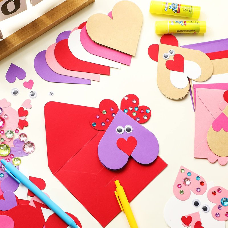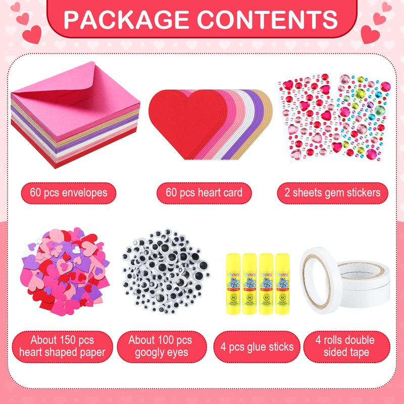 - Package contents: you will get 60 pieces of envelopes, 60 pieces of diy Valentine cards, 150 pieces of heart shaped paper, 100 pieces of googly eyes, 2 sheets of gem stickers, 4 rolls of double sided tape and 4 pieces of glue sticks, 380 pieces in total, abundant quantity and complete kit to support your different demands, making your handicrafts beautiful and charming on Valentine's Day