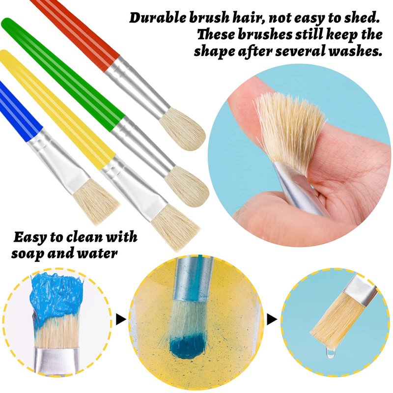 - QUALITY MATERIALS: High-quality paint brushes for kids, made of premium and soft hog bristle, colored handles, and rust-proof ferrules, non-toxic, safe, and durable. The bristles are firmly fixed and will not fall off, ensuring long-lasting use for young artists.