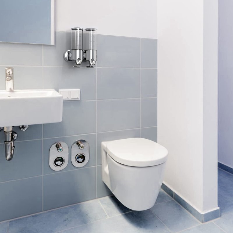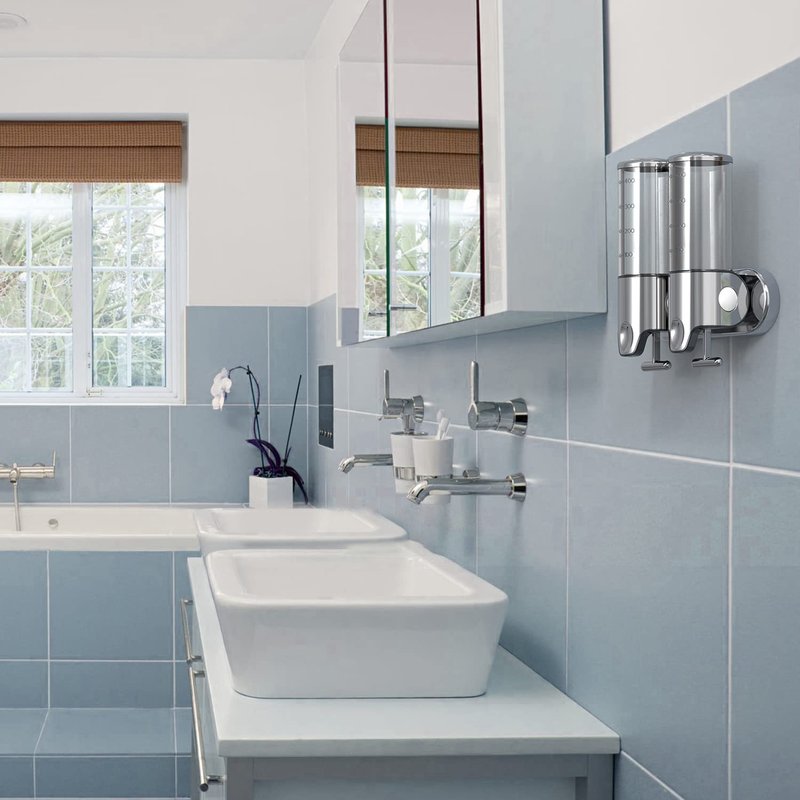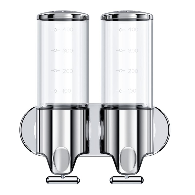 YIAOZ 2 in 1 Chamber Wall Mounted Bathroom Shower Pump Dispenser and Organizer,with Waterproof Label-Holds Shampoo,Conditioner,Shower Gel,for Bathroom Hotel,Non-drilled Wall Distributor(Colourless)