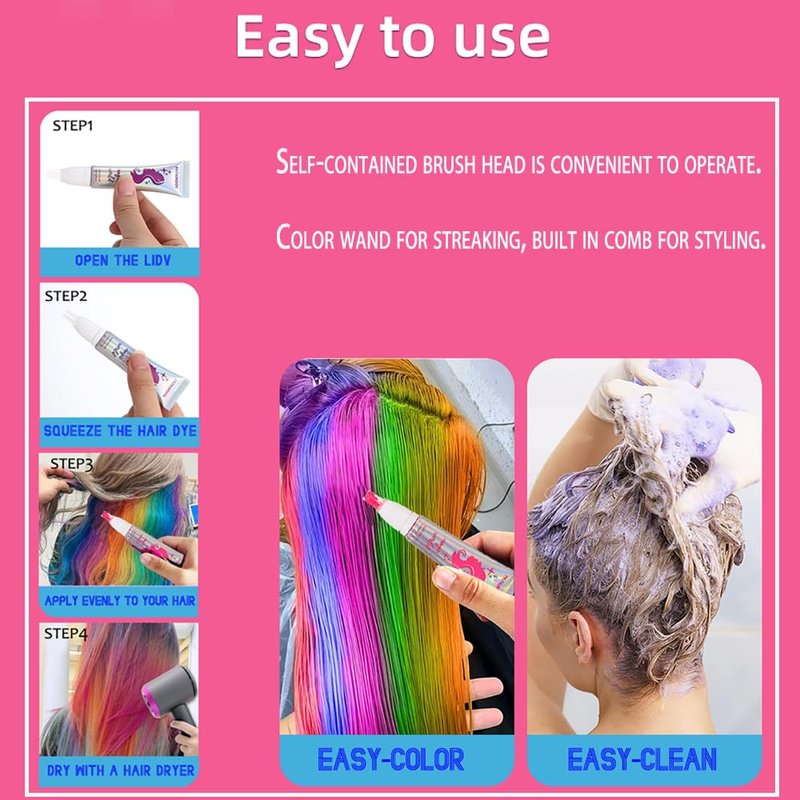 【Unique Brush Head Design】--- Self-contained brush head is convenient to operate. Color wand for streaking, built in comb for styling. To get your hair glowing, just apply the gel using your hands or an applicator brush. The gel dries quickly and is temporary so it easily washes out with shampoo and water;